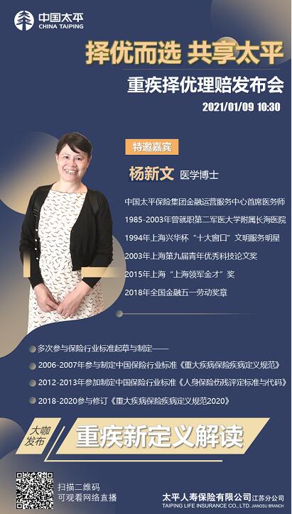為充分貫徹以客戶(hù)為中心的服務(wù)理念,太平人壽江蘇分公司將于2021年1月9日召開(kāi)重疾新政解讀暨擇優(yōu)理賠發(fā)布會(huì),本次發(fā)布會(huì)特邀2007版《重大疾病保險(xiǎn)疾病定義規(guī)范》、2013年中國(guó)保險(xiǎn)行業(yè)標(biāo)準(zhǔn)《人身保險(xiǎn)傷殘?jiān)u定標(biāo)準(zhǔn)與代碼》、《重大疾病保險(xiǎn)疾病定義規(guī)范2020》修訂專(zhuān)家委員會(huì)成員,中國(guó)太平保險(xiǎn)集團(tuán)金融運(yùn)營(yíng)服務(wù)中心首席醫(yī)務(wù)師——醫(yī)學(xué)博士楊新文博士,對(duì)新政進(jìn)行權(quán)威解讀,旨在讓更多的客戶(hù)了解重疾新政的變化及太平人壽相應(yīng)的舉措。