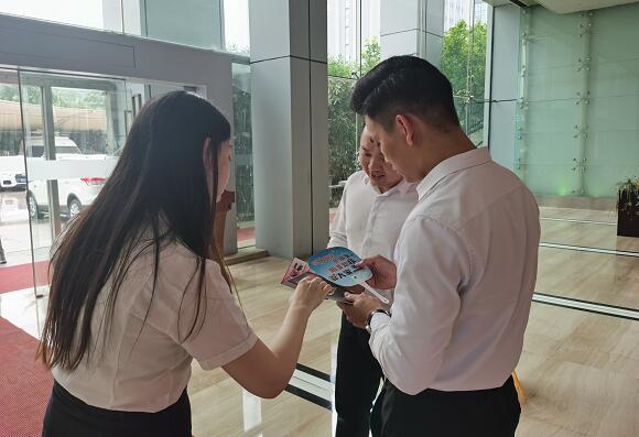 為更好地普及防非知識(shí)及《條例》內(nèi)容,太平人壽江蘇分公司于6月25日在置地廣場(chǎng)辦公樓一樓大廳開展集中宣傳活動(dòng)。制作了以“學(xué)法用法護(hù)小家·防非處非靠大家”、“《防范和處置非法集資條例》于5月1日起正式施行”等主題展板,營造濃厚的宣傳氛圍。此外,還制作了防非知識(shí)三折頁以及防非口號(hào)宣傳扇,宣傳扇上印制“學(xué)法用法護(hù)小家,防非處非靠大家、保險(xiǎn)助力保民生,欺詐騙保必嚴(yán)懲、防范洗錢嚴(yán)守法,金融安全你我他”宣傳口號(hào),在炎炎夏日讓金融知識(shí)給大家?guī)硪魂嚽屣L(fēng)。本次共計(jì)發(fā)放宣傳扇及防非三折頁170余份,現(xiàn)場(chǎng)還提供金融知識(shí)咨詢服務(wù),參與活動(dòng)人員可以與工作人員交流自己對(duì)金融和保險(xiǎn)方面的疑惑。