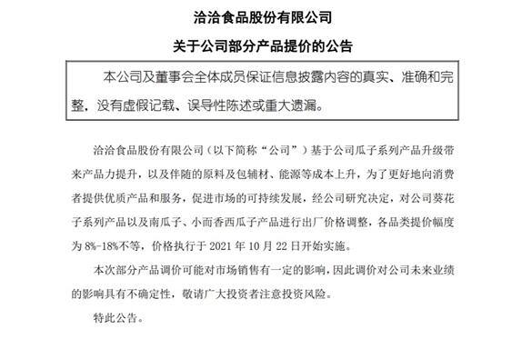 為了更好地向消費(fèi)者提供優(yōu)質(zhì)產(chǎn)品和服務(wù),促進(jìn)市場(chǎng)的可持續(xù)發(fā)展,經(jīng)公司研究決定,對(duì)公司葵花子系列產(chǎn)品以及南瓜子、小而香西瓜子產(chǎn)品進(jìn)行出廠價(jià)格調(diào)整,各品類提價(jià)幅度為8%-18%不等,價(jià)格執(zhí)行于2021年10月22日開(kāi)始實(shí)施。