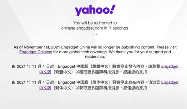 另外,Yahoo旗下著名科技媒體Engadget宣布,11月1日起關(guān)閉提供簡體中文內(nèi)容的“Engadget 中國版”。
