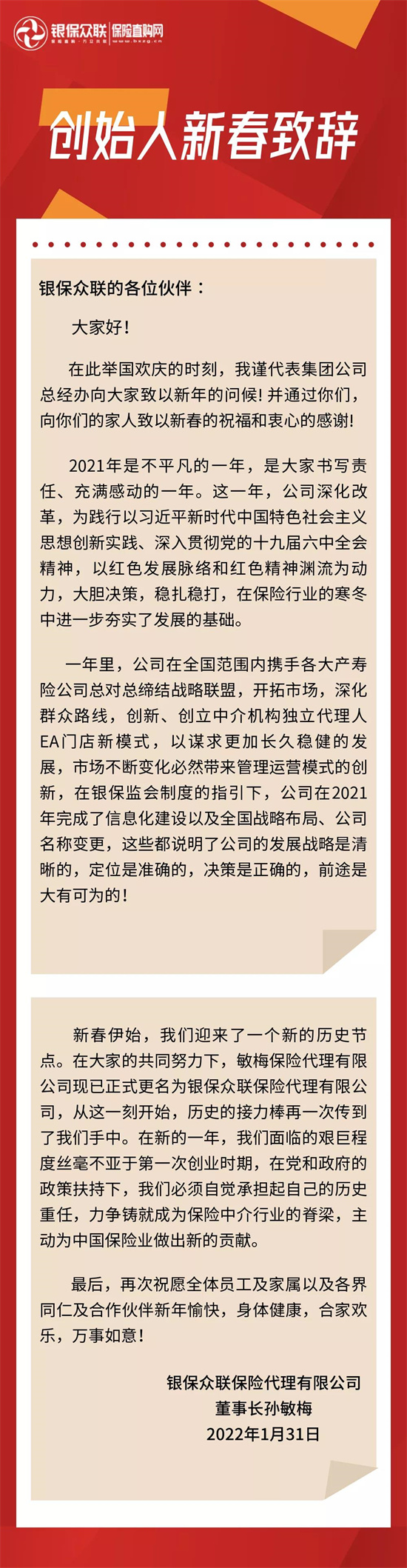 除夕將至,銀保眾聯(lián)保險(xiǎn)代理有限公司創(chuàng)始人孫敏梅向全體員工及家屬、各局領(lǐng)導(dǎo)、各界同仁以及合作伙伴致以新春祝福!