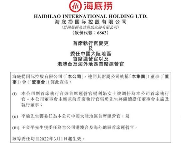 3月1日晚,海底撈發(fā)布管理層多項人事任命公告,其中包括海底撈現(xiàn)任CEO張勇卸任,由公司副CEO楊利娟接替,張勇將繼續(xù)擔任海底撈的董事會主席及執(zhí)行董事職務(wù)。