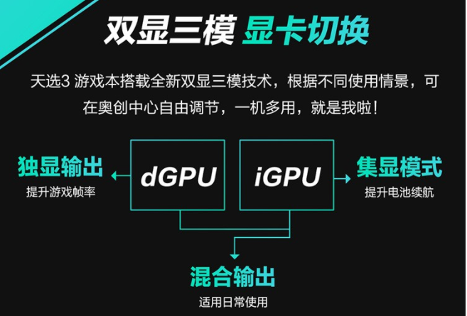 首先給不太清楚的小伙伴們科普一下,“雙顯三模”顯卡切換的作用是允許用戶根據(jù)筆記本使用的場(chǎng)景進(jìn)行顯卡模式切換,雙顯指有獨(dú)顯、集顯兩塊顯卡,而三模是指針對(duì)這兩塊顯卡,系統(tǒng)可以提供三種不同的模式調(diào)用,分別有獨(dú)顯輸出、混合輸出以及集顯模式三種模式。