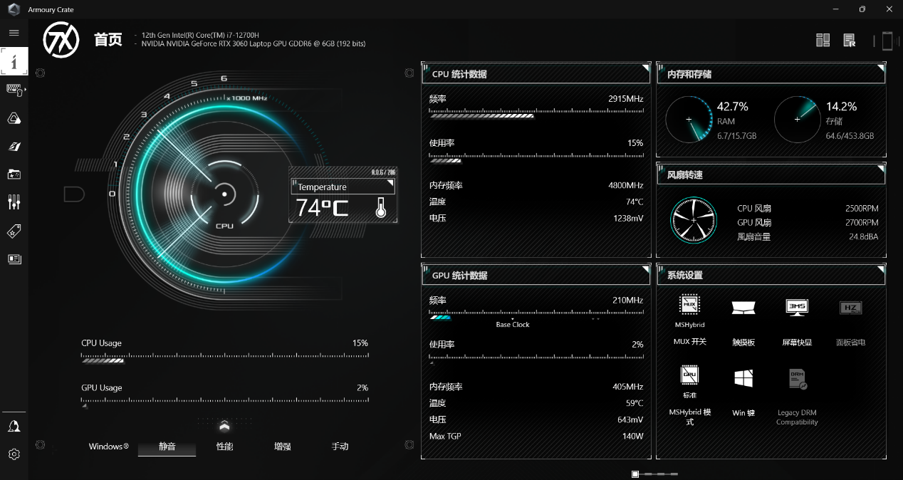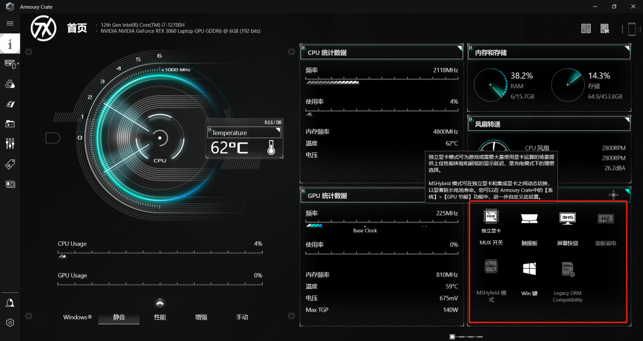 可能有些小伙伴就好奇了,我的華碩天選3也有這些功能啊?可我怎么一次沒(méi)體會(huì)過(guò)?這是因?yàn)樘爝x3并沒(méi)有為玩家設(shè)置門(mén)檻,給予玩家最大的使用自由權(quán),想要變更輸出模式需要采取手動(dòng)切換,在軟件中的“Armoury Crate 奧創(chuàng)游戲智控中心”切換,如果你點(diǎn)開(kāi)奧創(chuàng)智控中心時(shí)候,你的奧創(chuàng)中心如果和下圖所示一樣的話,說(shuō)明你的電腦現(xiàn)在處于獨(dú)顯模式,此時(shí)你電腦運(yùn)行游戲等高負(fù)載應(yīng)用時(shí)幀率會(huì)提高,但相應(yīng)的,不插電時(shí)候的待機(jī)時(shí)間會(huì)縮短,玩游戲固然爽,但要小心打到一半就關(guān)機(jī)了。