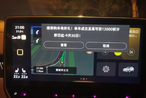9月23日,重慶的劉女士駕駛剛買不久的一汽大眾ID.6Crozz純電車,在使用車載導(dǎo)航進(jìn)行導(dǎo)航時(shí),顯示導(dǎo)航信息的中控屏幕突然出現(xiàn)彈窗廣告,遮擋了行駛中的導(dǎo)航信息。9月24日,王女士告訴上游新聞?dòng)浾撸?ldquo;第一次在行駛的汽車的中控屏上看到彈出的廣告,活久見(jiàn),不喜歡有這樣的彈窗。”上游新聞?dòng)浾邚膭⑴空故镜膱D片看到,中控觸摸屏顯示,車載4G網(wǎng)絡(luò)信號(hào)滿格,車輛正途徑一座立交橋,彈窗廣告面積幾乎占了觸摸屏的一半,駕駛員正在使用的導(dǎo)航行駛信息幾乎完全被遮擋。彈窗廣告上寫(xiě)著“推薦購(gòu)車有好禮!單車成交至高可獲12000積分 即日起-9月30日!”從內(nèi)容上看,劉女士告訴記者:“這個(gè)彈窗廣告應(yīng)該是廠家推送的,因?yàn)榉e分是大眾的,而不是4S店的。”