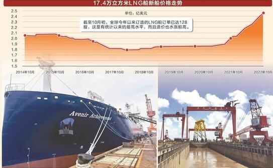 LNG船訂單“一枝獨秀”,造價也水漲船高。據(jù)中國船舶集團經(jīng)濟研究中心方面透露,2022年10月初, LNG船新船價格為2.45億美元,較年初上漲14.5%,創(chuàng)下2014年以來最高水平。